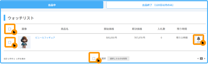 - 商品一覧左側のチェックボックスを選択して、一覧から削除することもできます。また、商品のサムネイル画像や商品詳細ページの☆マークを再度クリックすることによってもウォッチリストから登録解除できます。