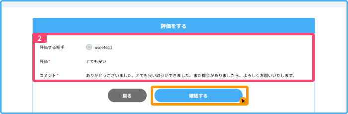 - 商品の受け取り処理を行うと一連の取引が完了し「評価」ボタンをクリックして出品者を評価してください。