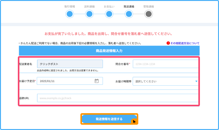 - 商品の発送後、「問合せ番号」「お届け予定日」をかならず入力し、お手元に情報があれば「お届け時間帯」と「追跡URL」を入力の上、「発送情報を送信する」ボタンをクリックして落札者へ連絡しましょう。