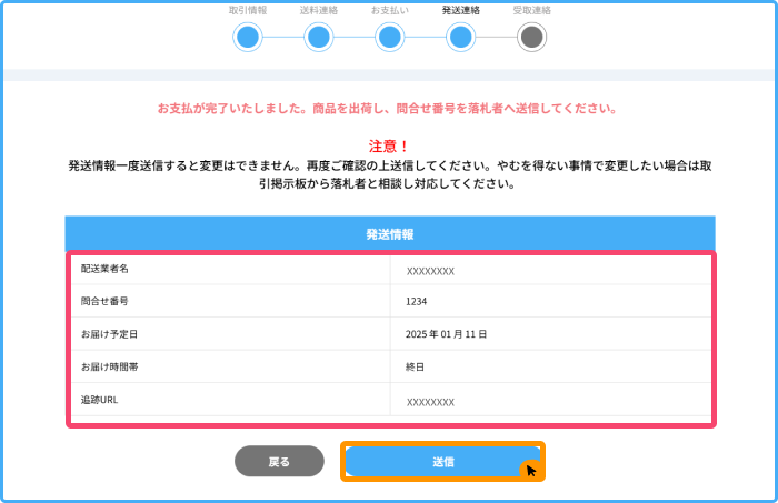 - お届け時間帯と追跡URLの入力は必須ではありませんが、落札者の確認やスムーズな商品受取に役立ちますので、可能な限り入力をお願いします。