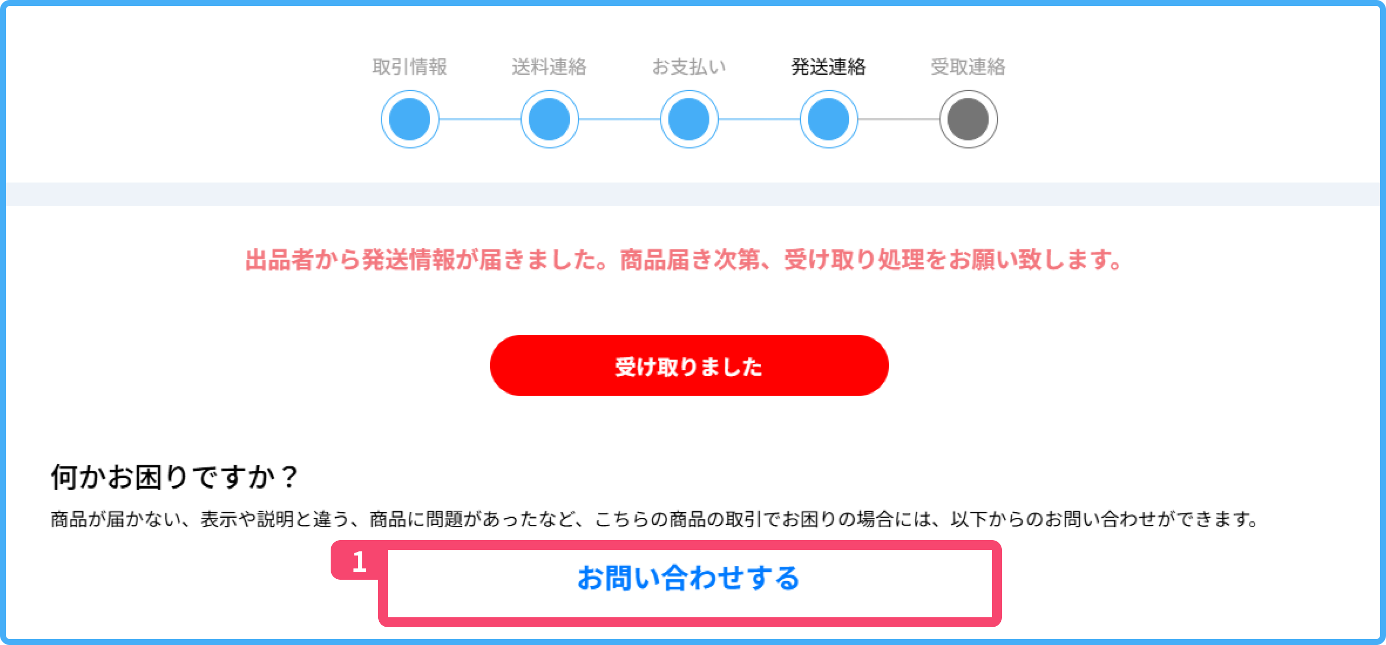 - 支払後 7日以内で発送連絡がない、もしくは8日過ぎても商品が届かない場合は取引画面上にある上記の「お問い合わせする」ボタンをクリックして次の対応にお進みください。