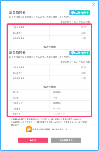 - ご依頼の内容を確認後、チェックボックスにマーク付けて再度「出金依頼する」をクリックしてください。